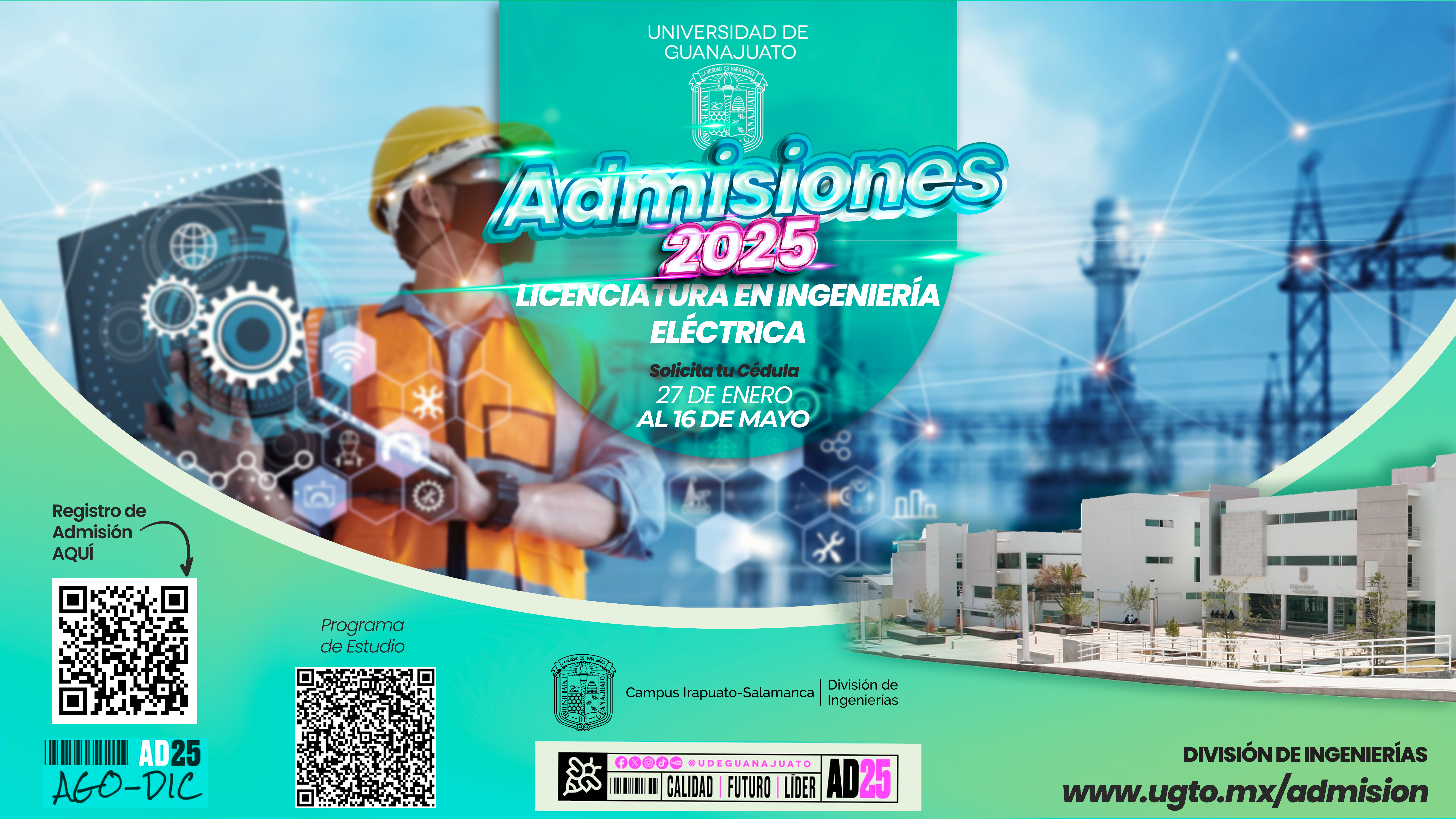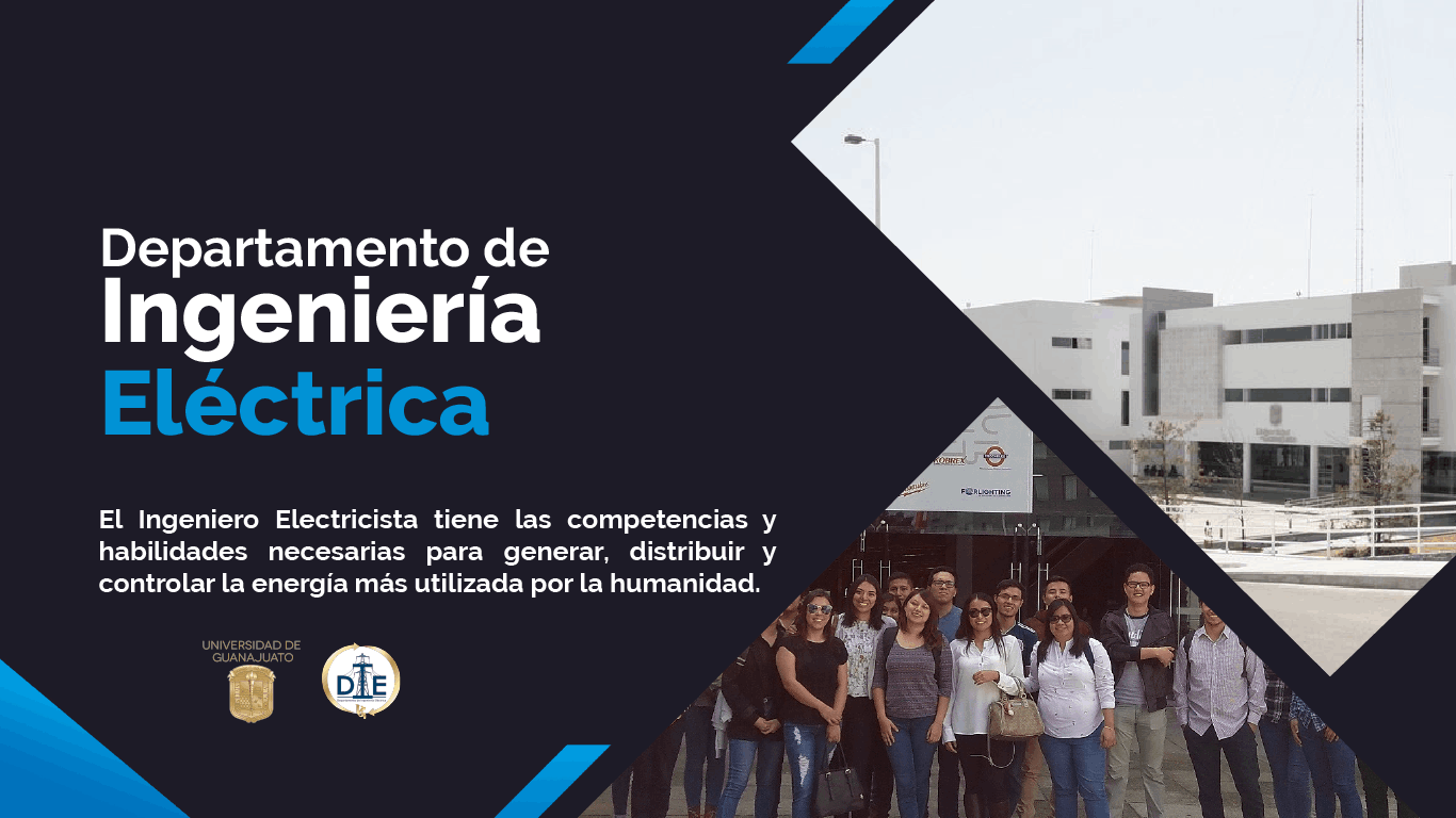 La Energía Eléctrica es una necesidad fundamental para la humanidad, con ella se han podido crear las tecnologías más avanzadas que el mundo ha conocido y conocerá. El Departamento de Ingeniería Eléctrica (DIE) de la Universidad de Guanajuato, proporcionará las competencias y habilidades necesarias para generar, distribuir y controlar la Energía Eléctrica y afrontar nuevos retos, como transitar hacia una Red Eléctrica Inteligente a través del Internet de las Cosas (IOT), Sustentabilidad Energética, Electromovilidad, Ciudad y Edificaciones Inteligentes, y Automatización y Control.